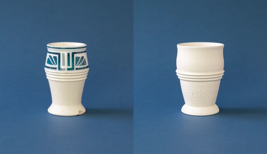 Links: Albin Müller, Zahnputzbecher um 1913 für das Sanatorium Dr. Barner, Foto: Tom McCallie;